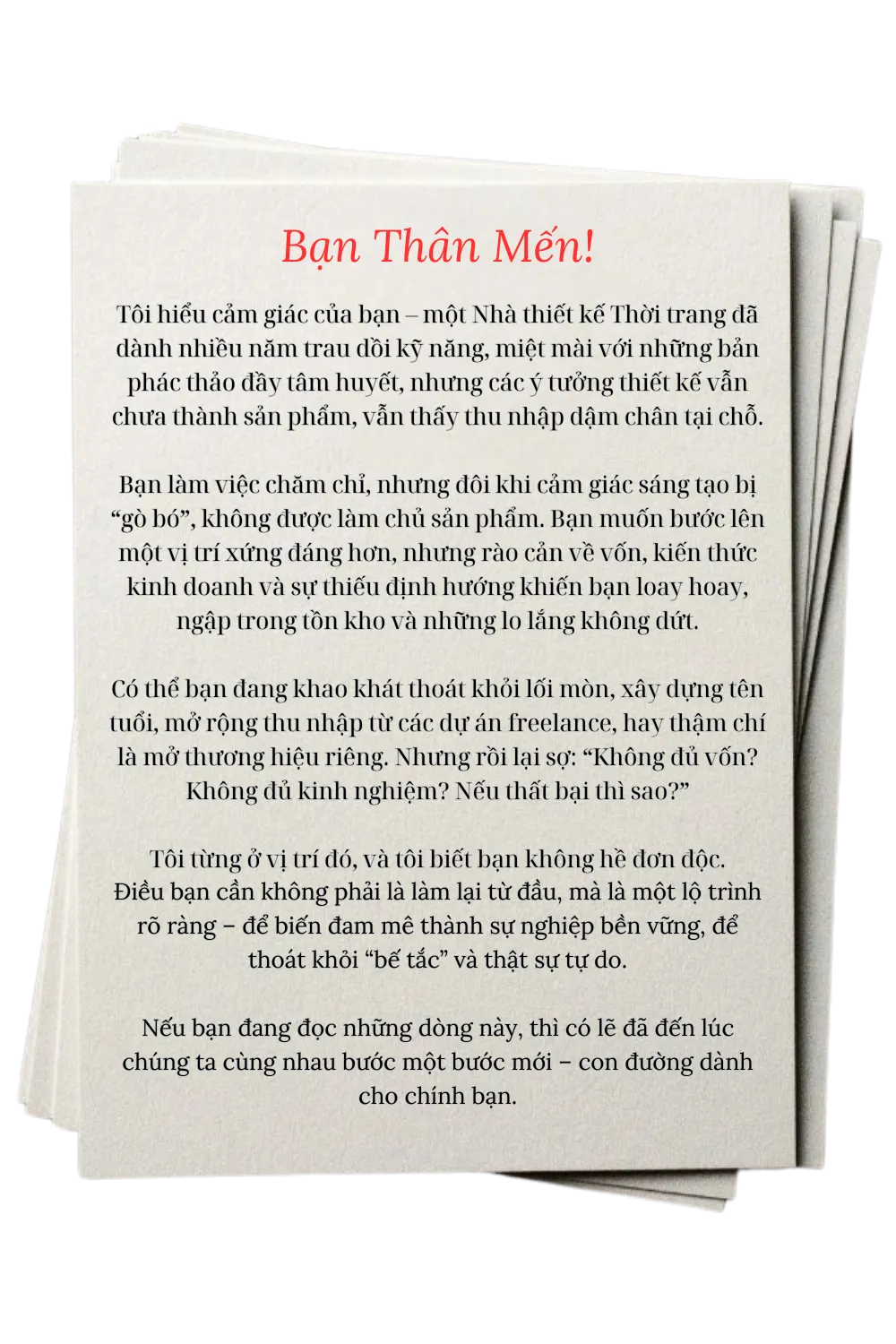 Trước khi tham gia khóa học, mình luôn loay hoay với ý tưởng thời trang nhưng không biết bắt đầu từ đâu. Sau khi học, mình đã biết cách lên kế hoạch sản phẩm, làm việc với xưởng và tự tin ra mắt bộ sưu tập đầu tay. Đây là bước ngoặt lớn với mình.